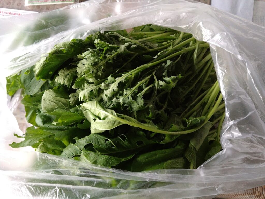 この時期畑では沢山の野菜が収穫出来ています。ピーマン、ナス、小松菜、春菊等です。種をまいた野菜が一斉に収穫時期を迎えています。葉物野菜を十分に頂いています。ただ彩りとしては赤いニンジンが欲しいところですが、ニンジンの収穫はまだ先になります。