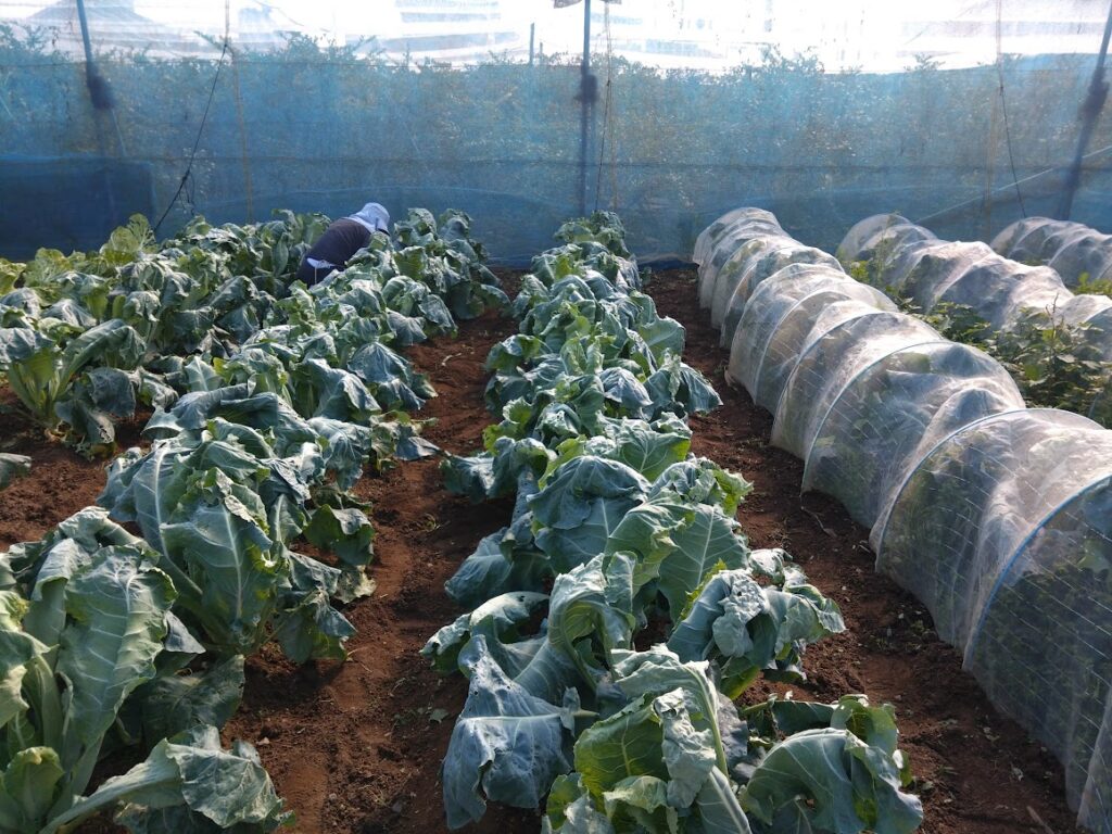 午前中に畑へ行って草取りをしました。昨日一日で3列で白菜の寒冷紗まで行きました。今日はまた3列でカリフラワーまで終わりました。寒冷紗を取って気が付いたのですが、カリフラワーの中心に10円玉くらいの小さい花蕾がすでに確認できます。