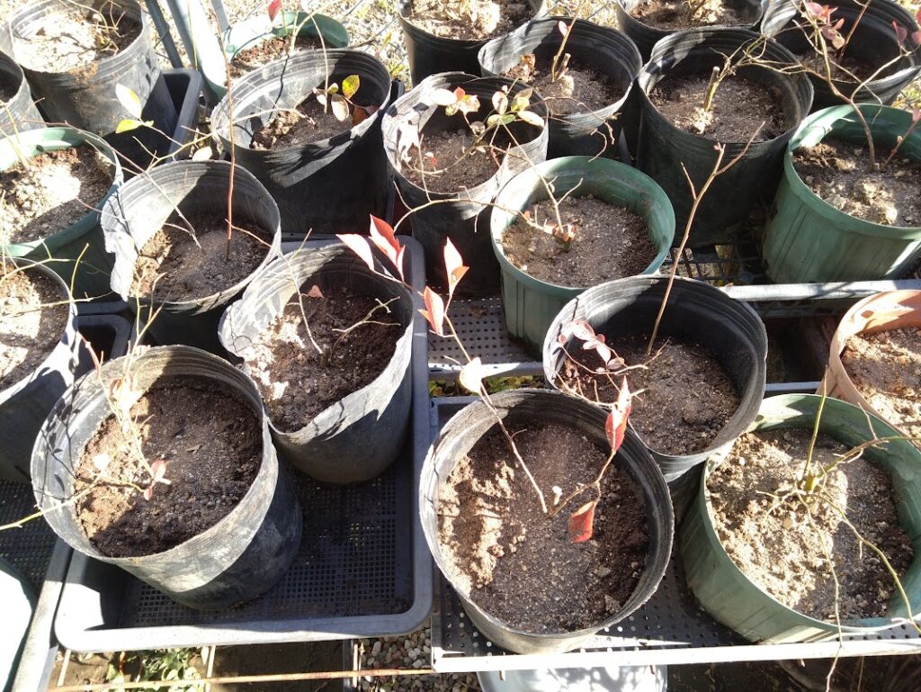 先日定植した、ブルーベリー苗木と同じものを大きなポットに移植しました。同じ苗でも一年間小さいポットのままだと、まったく大きくなりません。やはり大きなポットでないとその差は歴然です。一年間で定植できるものが、2年間かかります。