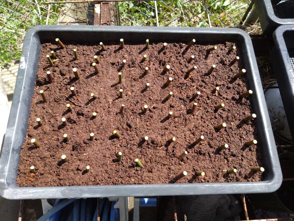 先月中旬の接ぎ木と時を同じくして、接ぎ木の台木となる木となる、穂木を挿し木しましたが、やはり発芽が確認できました。早生種の北部ハイブッシュは温暖化には弱く、どんどん自根は枯れています。そのための対策としてどんどん台木を作っています。