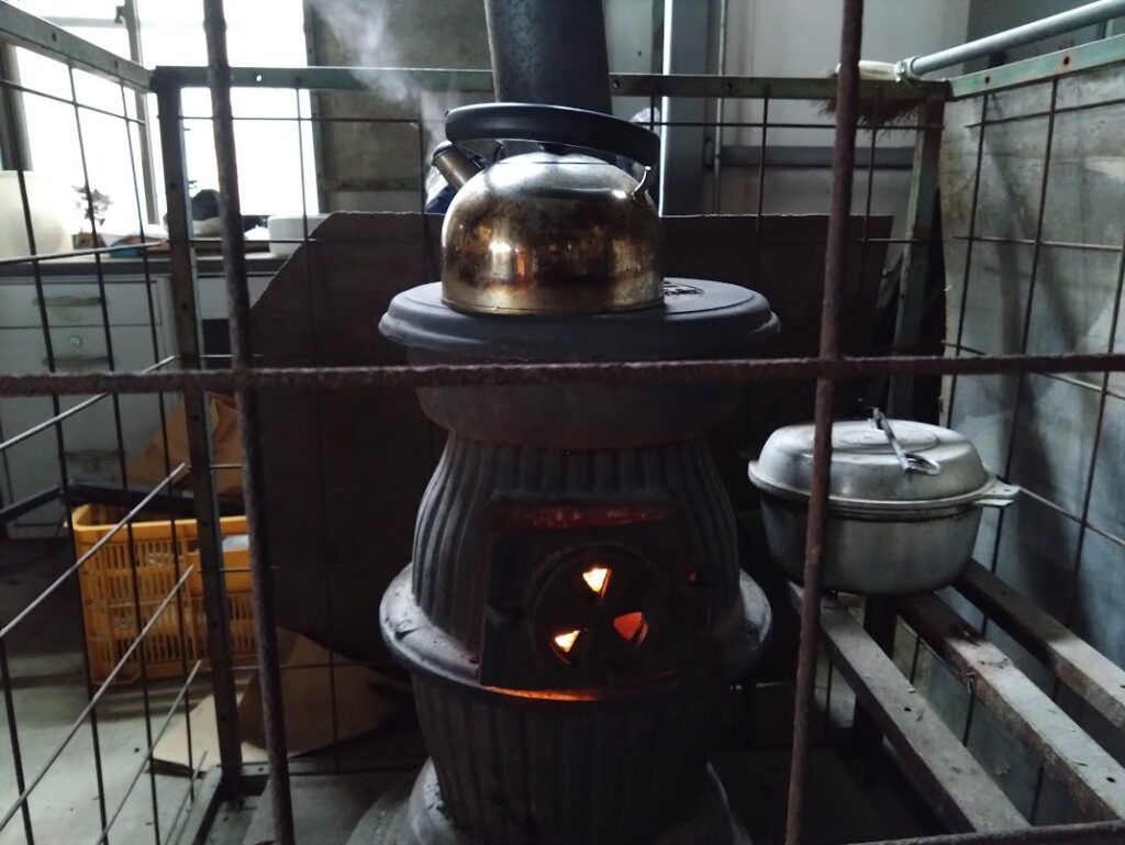 現在使っている薪ストーブは50年はオーバーですが40年以上50年未満です。主人も正確な年数は判らないみたいです。平成10年頃に新工場に移転しましたので、今年が令和8年ですから30年近くで、それ以前の古い工場の時はすでにありましたのでやはり40年以上になります。1週間くらい前に大きな穴があきましたので、主人が溶接で補修しました。