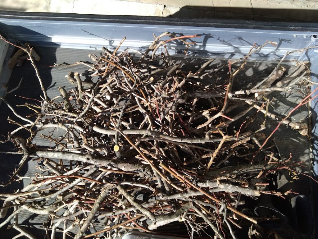 昨日で一応支柱への枝の誘引作業が終わりましたので、今日は剪定枝の後片付けをしました。家に運びましたがまだ生木のため、薪ストーブで燃やすことは出来ないため、乾燥させてから4月ごろにストーブに入れる予定です。