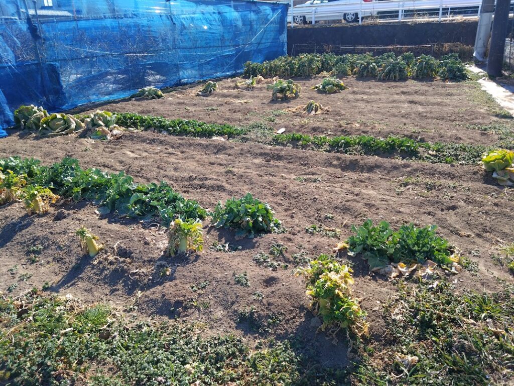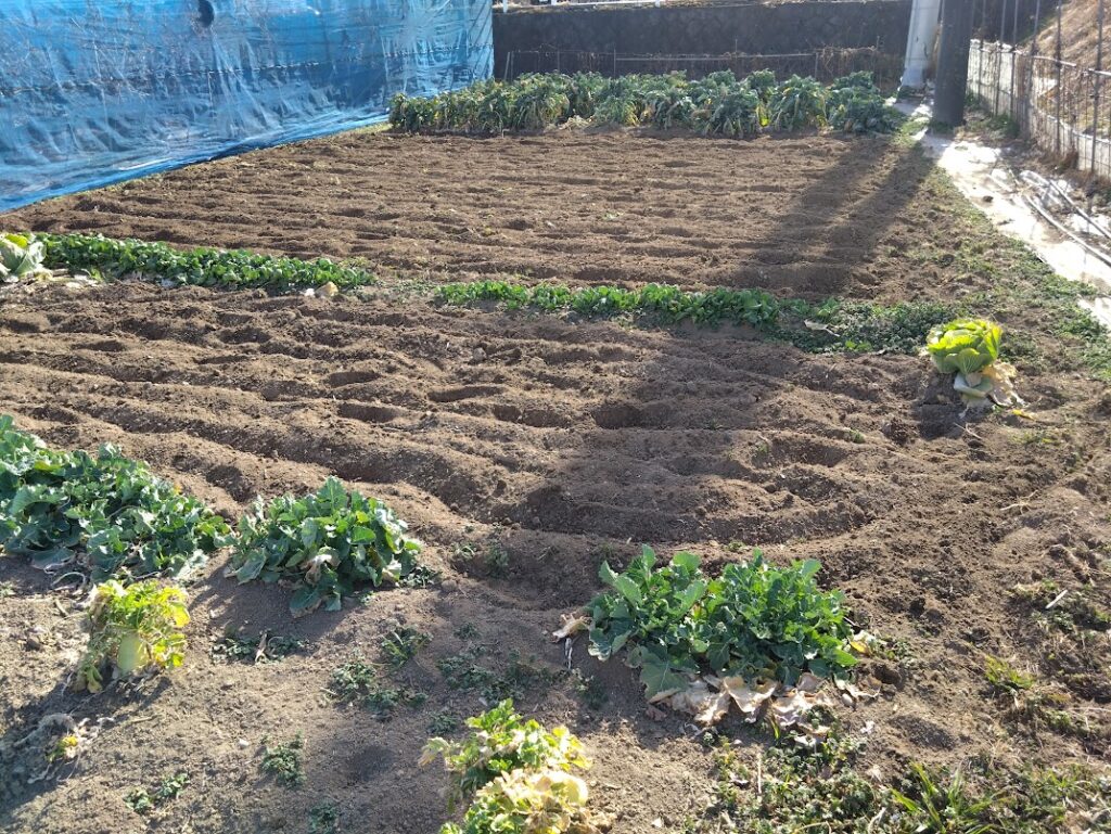 花が咲いているブロッコリーを抜いて、もうすでに運んであるたい肥を全面に蒔いて、さらに1年前からある落ち葉から腐葉土になったものを耕運機ですきこんで、明日に予定している、ジャガイモの定植の準備をしました。