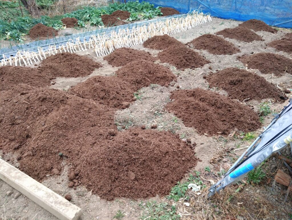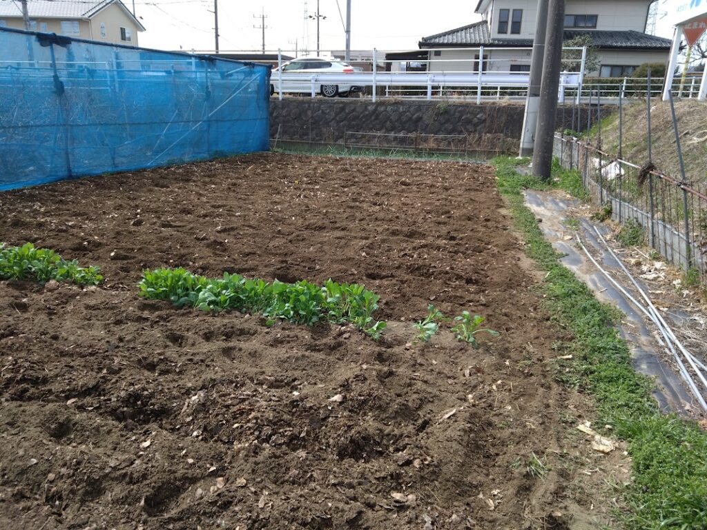 野菜畑の南側はジャガイモ定植のため、ほとんど空き地がなく、耕運が終わりました。今日から北側に移りました。すでにおいてあるたい肥の上に、南側同様に腐葉土を蒔きました。その後すぐに耕運しました。来月になるといろいろの野菜の苗を植える予定です。